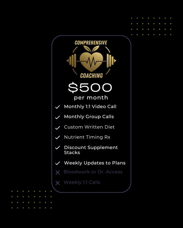 Comprehensive + weekly 1:1 video calls + custom training and diet plans + lab bloodwork + concierge MD w/ full pharmacy access and wholesale cost supplements.