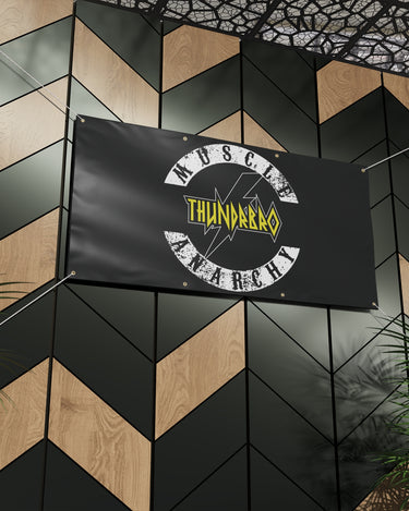 This matte vinyl banner brings bold, gritty energy to any wall, Gym, or event space. The black matte background makes the distressed white circular logo and electric yellow emblem pop with intentionally rough edges and rock‑era attitude. Weather‑resistant inks and heavy 15oz blockout scrim vinyl keep colors vibrant and prevent show‑through, so your graphic stays striking whether mounted indoors or tied to a railing outside. Brass grommets and included ropes make hanging quick and secure, while trimmed edges keep the surface smooth and clean. Use it to amplify a rehearsal room, mark a backyard stage, or add instant personality to a garage, venue, or merch booth.